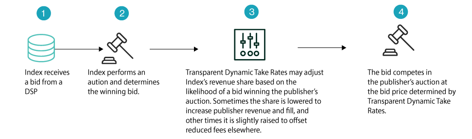 Transparent Dynamic Take Ratesプログラムは、取引毎にIndexの収益シェアを動的に調整するスマートプライシング機能です。本機能は、オークションの効率性を高めることで落札件数を増加させ、パブリッシャーの収益向上を図るよう設計されています。本機能は、フロアプライス パブリッシャーとエクスチェンジで使用される、インベントリの最低販売価格。の変更やバイヤーによる入札額の調整を必要とせずに機能します。