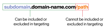 ドメインターゲティングの設定には柔軟なオプションが利用いただけます。一般に、トップレベル・ドメイン名とサブドメインをターゲットにすることはできますが、次の図に示すように、パスレベルのサブディレクトリを含むドメインをターゲットにすることはできません。