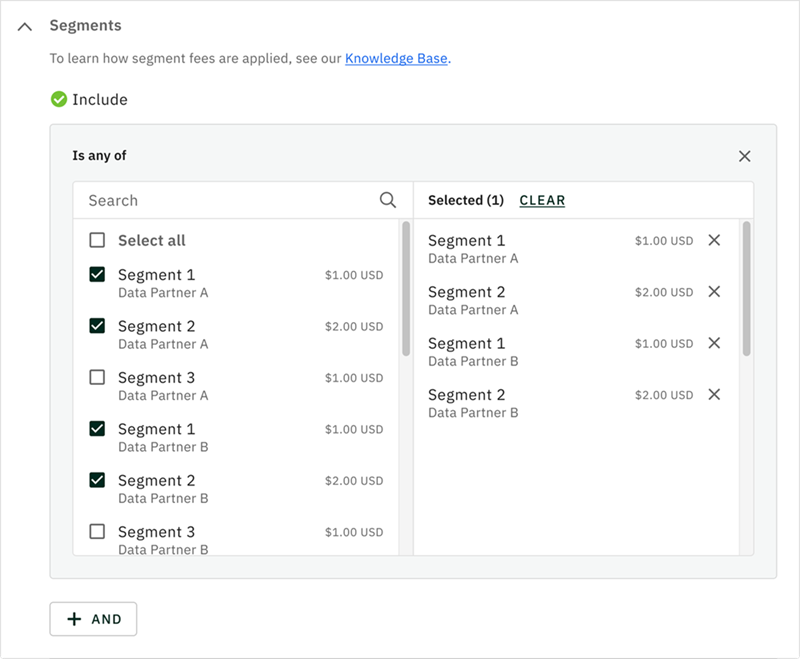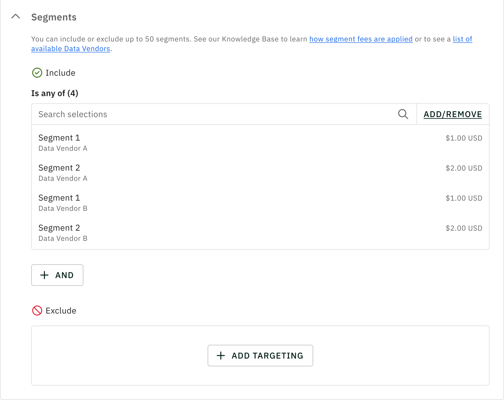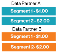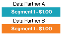 In this scenario, one segment from Data Vendor A and one segment from Data Vendor B have activated the deal. Both segment fees would be applied because each Data Vendor must collect a fee. |